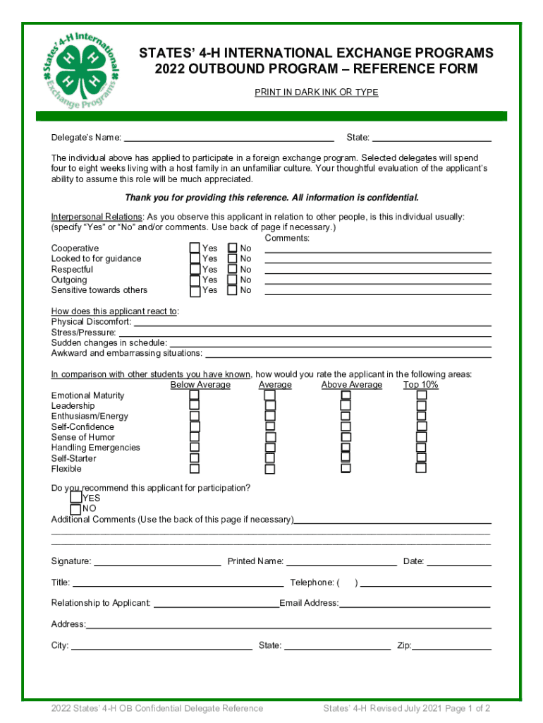 STATES 4H INTERNATIONAL EXCHANGE PROGRAMS 2022 OUTBOUND PROGRAM REFERENCE FORM PRINT IN DARK INK OR Superdelegates Name:State:The individual above has applied to participate in a foreign exchange