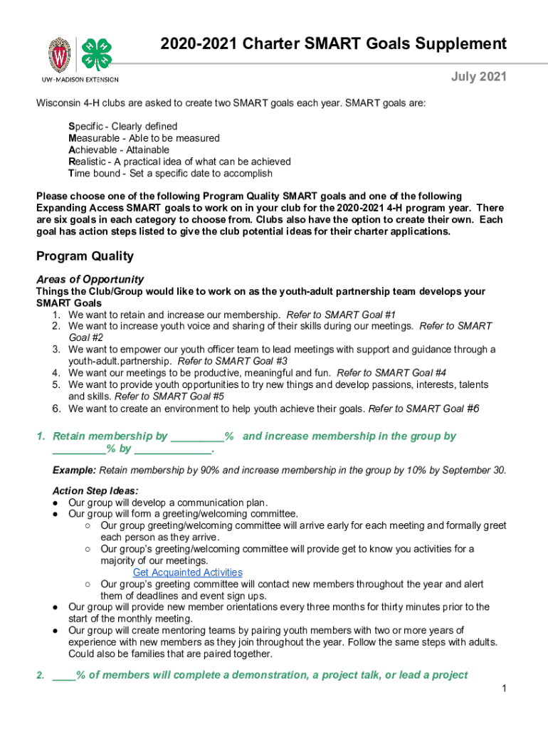 20202021 Charter SMART Goals Supplement July 2021 Wisconsin 4H clubs are asked to create two SMART goals each year. SMART goals are: Specific Clearly defined Measurable Able to be measured Achievable