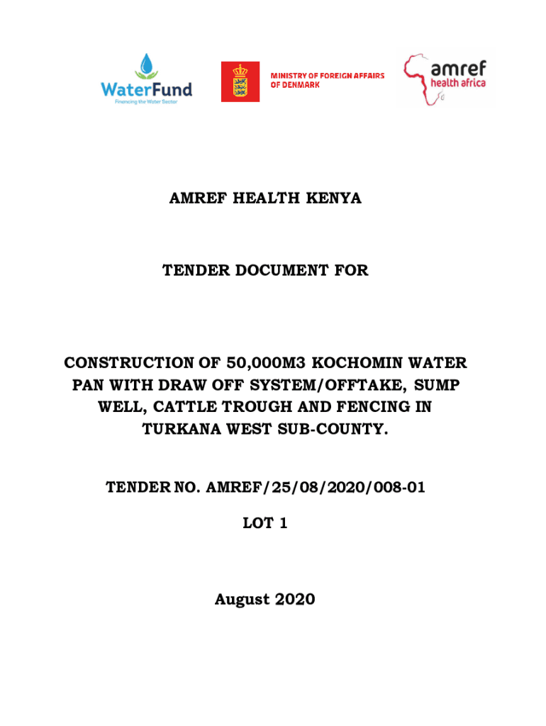 AMREF HEALTH KENYATENDER DOCUMENT CONSTRUCTION OF 50,000M3 CHOPIN WATER PAN WITH DRAW OFF SYSTEM/OFFSTAGE, SUMP WELL, CATTLE TROUGH AND FENCING IN PURANA WEST COUNTY. TENDER NO. AMREF/25/08/2020/00801