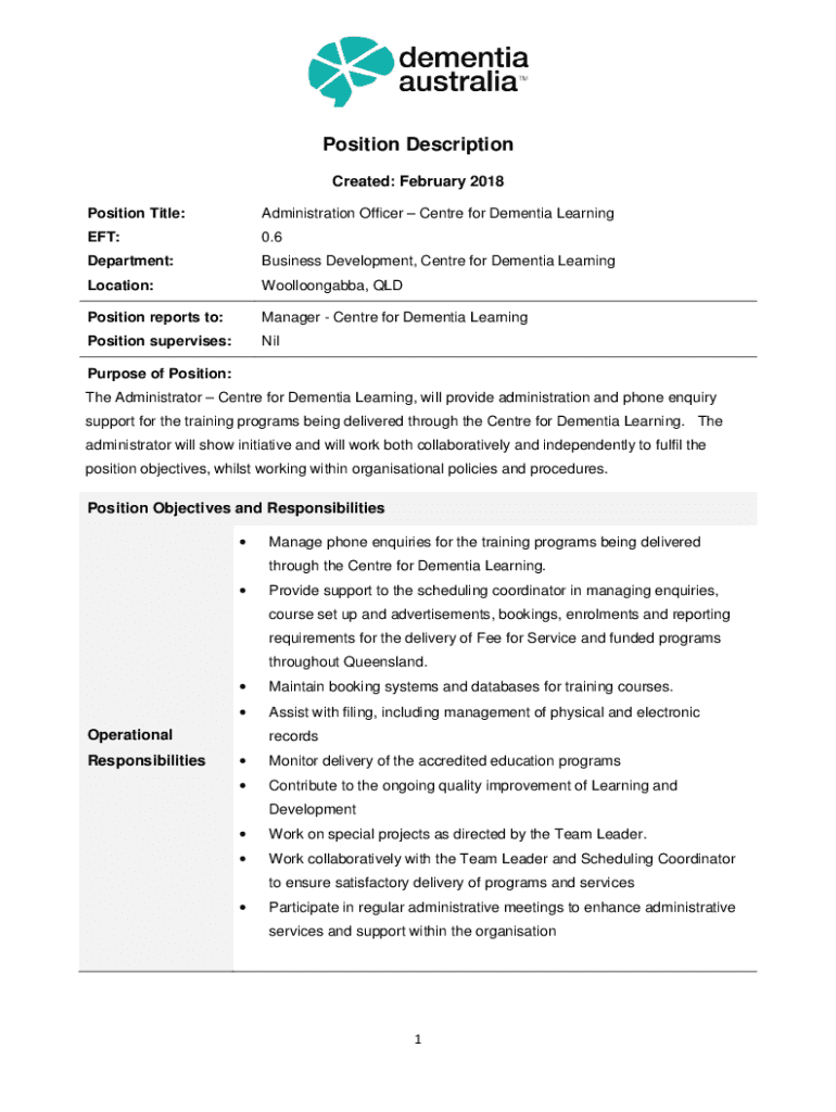 Position Title:Administration Officer Center for Dementia Learning EFT:0.6Department:Business Development, Center for Dementia LearningLocation:Woolloongabba,