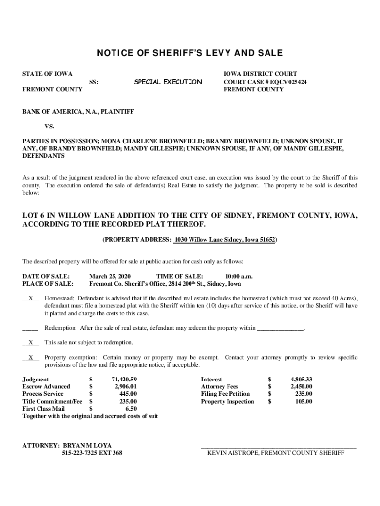 NOTICE OF SHERIFFS LEVY AND SALE STATE OF IOWASPECIAL EXECUTIONS: FREMONT COUNTDOWN DISTRICT COURT CASE # EQCV025424 FREMONT MOUNTEBANK OF AMERICA, N.A., PLAINTIFF VS. PARTIES IN POSSESSION; MONA
