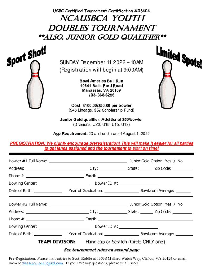 USB Certified Tournament Certification #06404NCAUSBCA YOUTH DOUBLES TOURNAMENT**ALSO, JUNIOR GOLD QUALIFIER** SUNDAY, December 11, 2022 10AM (Registration will begin at 9:00AM) Bowl America Bull Run