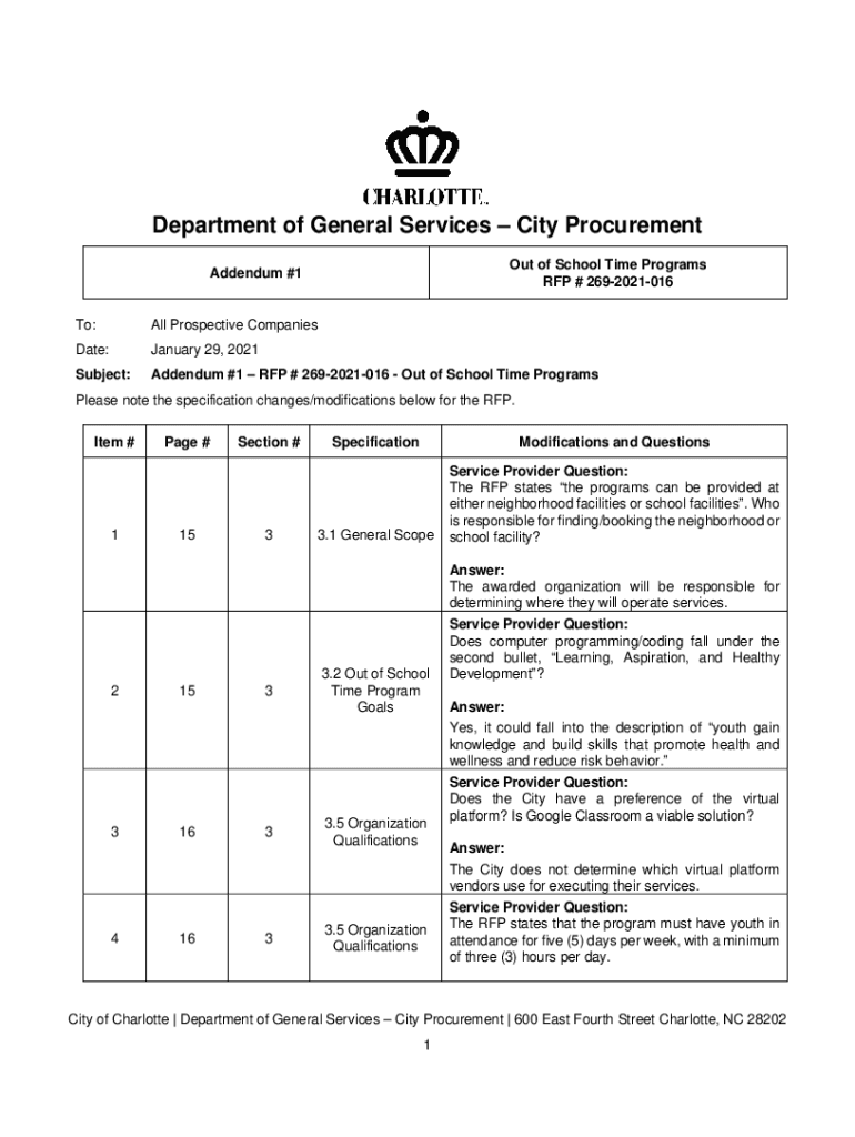 Department of General Services City Procurement Out of School Time Programs RFP # 2692021016Addendum #1To:All Prospective CompaniesDate:January 29, 2021Subject:Addendum #1 RFP # 2692021016 Out of