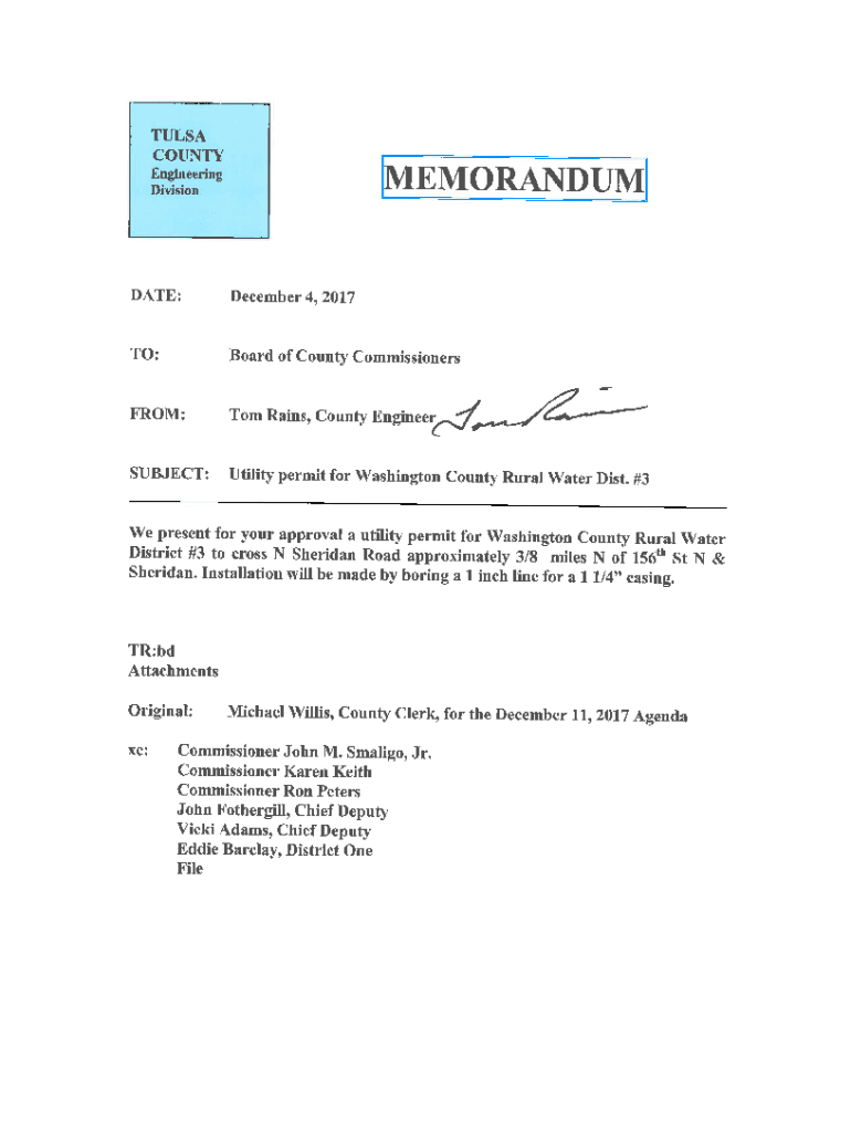 TULSA COUNTYMEMORANDUMEngineering Divisional:December 4, 2017TO:Board of County CommissionersFROM:Tom Rains, County Engineer, SUBJECT: Utility permit for Washington County Rural Water Dist. #3Wepresent