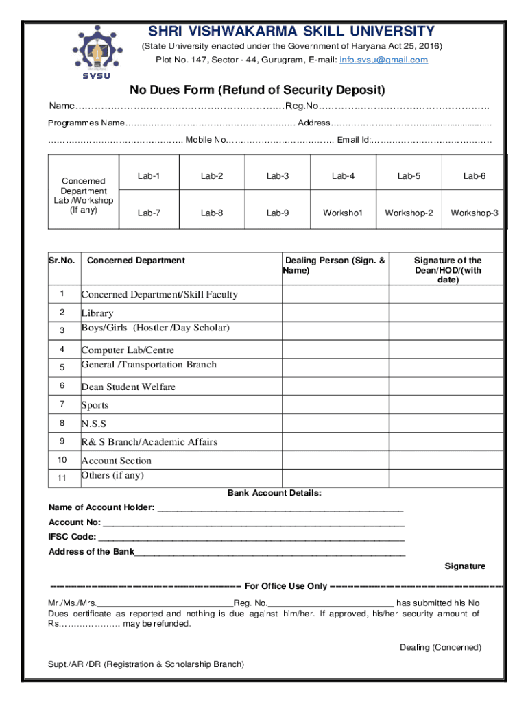 SARI VISHWAKARMA SKILL UNIVERSITY (State University enacted under the Government of Haryana Act 25, 2016) Plot No. 147, Sector 44, Guru gram, Email: info.svsu@gmail.comNo Dues Form (Refund of Security