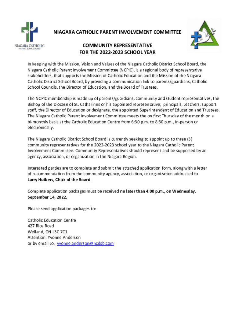 NIAGARA CATHOLIC PARENT INVOLVEMENT COMMITTEE COMMUNITY REPRESENTATIVE FOR THE 20222023 SCHOOL YEAR In keeping with the Mission, Vision and Values of the Niagara Catholic District School Board, the