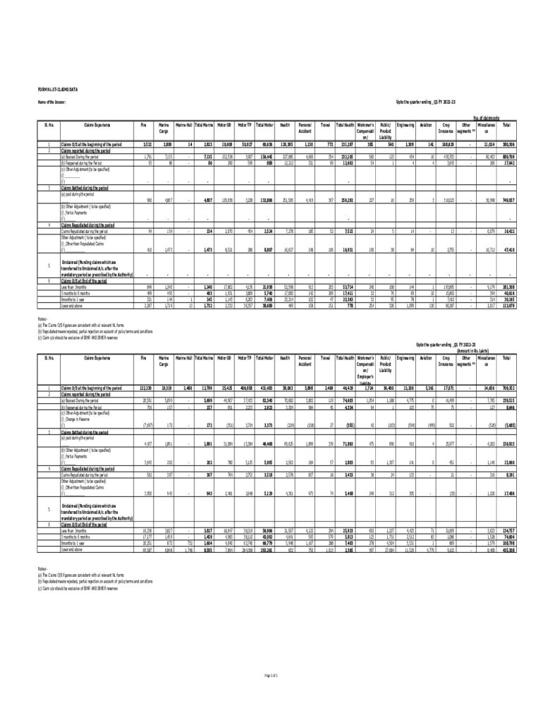 FORM NL37CLAIMS DATA Unto the quarter ending _Q1 FY 202223Name of the Insurer:SL. No.1 2345 6Claims ExperienceClaims O/S at the beginning of the period Claims reported during the period (a) Booked