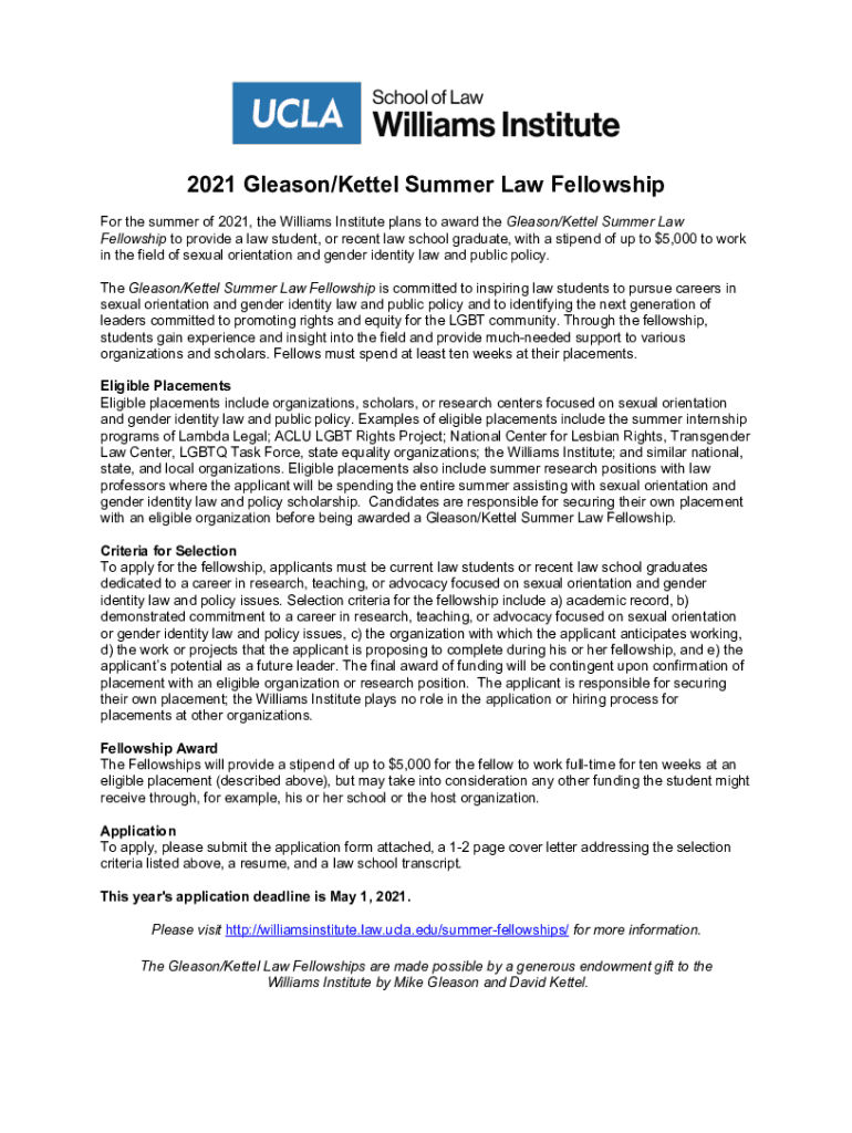 2021 Gleason/Kettle Summer Law Fellowship For the summer of 2021, the Williams Institute plans to award the Gleason/Kettle Summer Law Fellowship to provide a law student, or recent law school graduate,