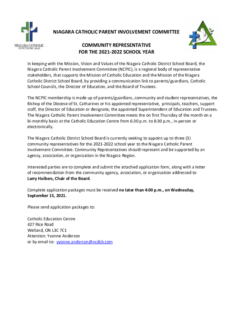 NIAGARA CATHOLIC PARENT INVOLVEMENT COMMITTEE COMMUNITY REPRESENTATIVE FOR THE 20212022 SCHOOL YEAR In keeping with the Mission, Vision and Values of the Niagara Catholic District School Board, the