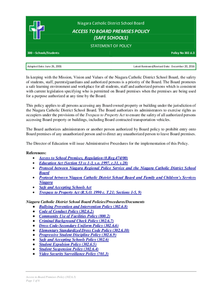 Niagara Catholic District School BoardACCESS TO BOARD PREMISES POLICY (SAFE SCHOOLS) STATEMENT OF POLICY 300 Schools/StudentsAdopted Date: June 26, 2001Policy No 302.6.3Latest Reviewed/Revised Date: