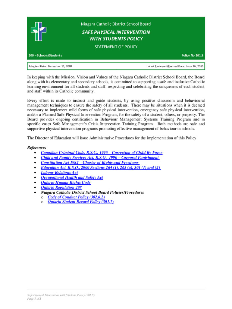 Niagara Catholic District School Board SAFE PHYSICAL INTERVENTION WITH STUDENTS POLICY STATEMENT OF POLICY 300 Schools/Students Adopted Date: December 15, 2009Policy No 301.8 Latest Reviewed/Revised