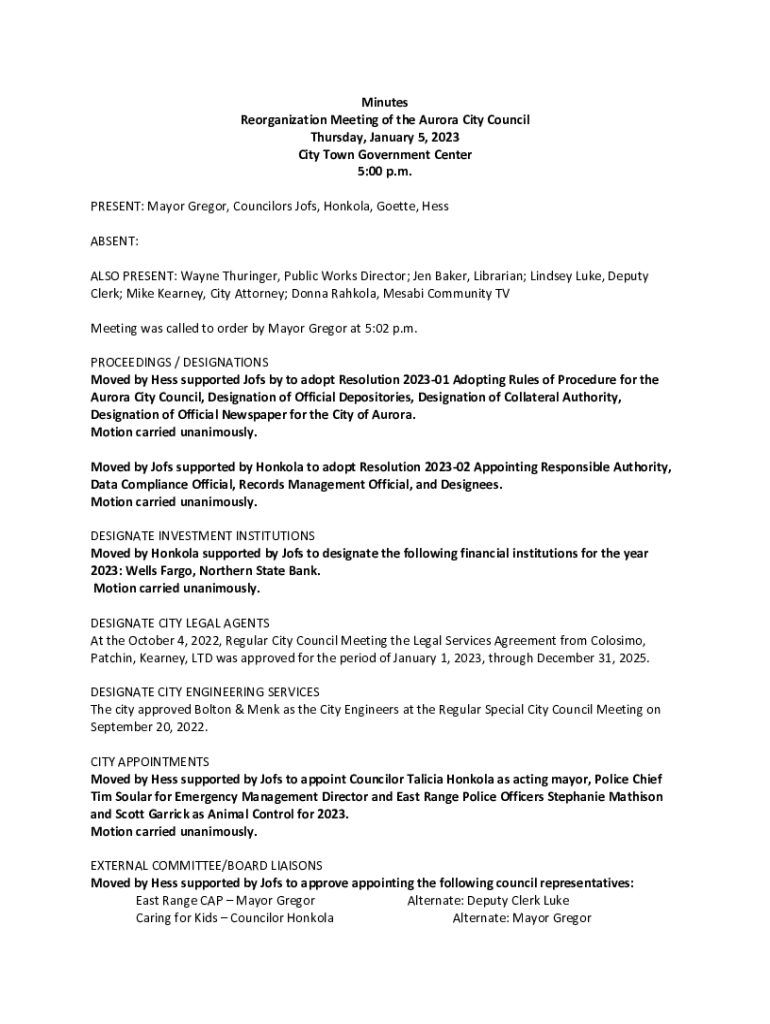 Minutes Reorganization Meeting of the Aurora City Council Thursday, January 5, 2023, City Town Government Center 5:00 p.m. PRESENT: Mayor Gregor, Councilors Jobs, Hon kola, Goethe, Hess ABSENT: ALSO