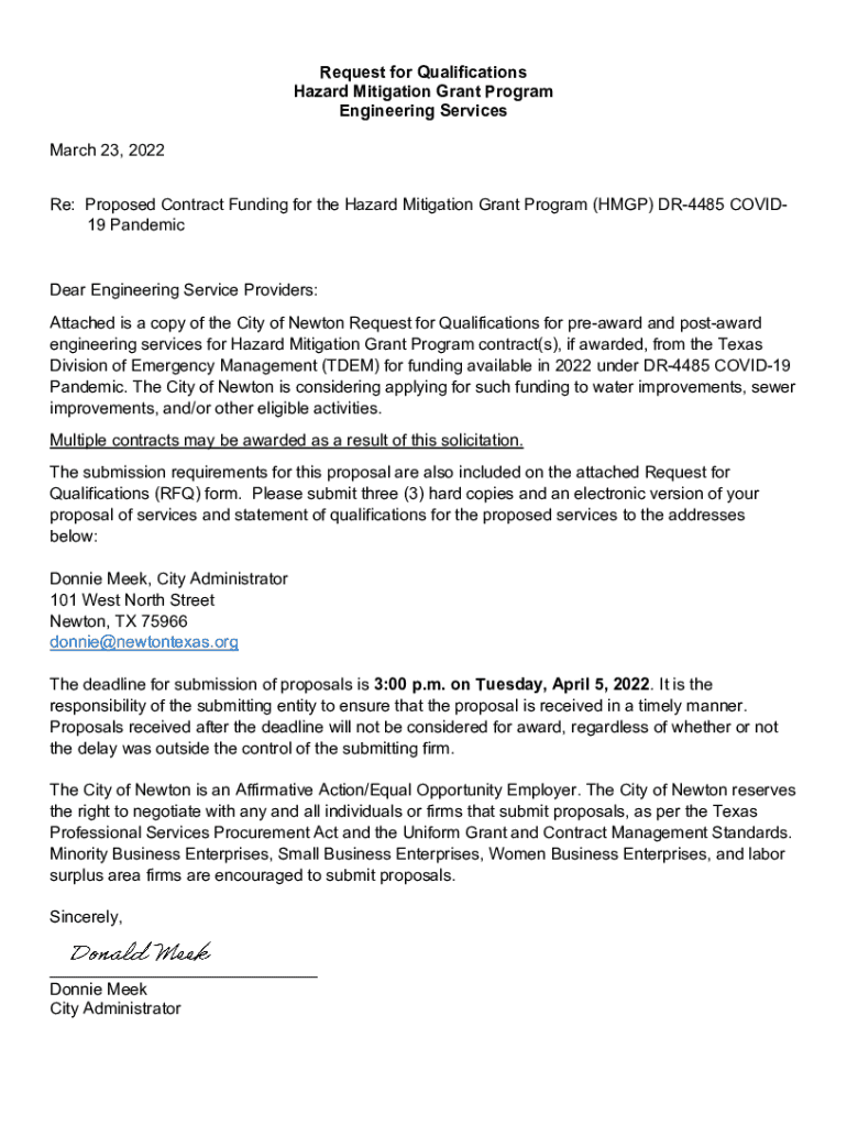 Request for Qualifications Hazard Mitigation Grant Program Engineering Services March 23, 2022, Re: Proposed Contract Funding for the Hazard Mitigation Grant Program (HEGP) DR4485 COVID-19 Pandemic