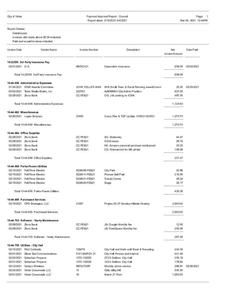 City of VictorPayment Approval Report Council Page:Report dates: 2/19/20213/4/2021 Report Criteria: Detail report. Invoices with totals above $0.00 included. Paid and unpaid invoices included. Invoice