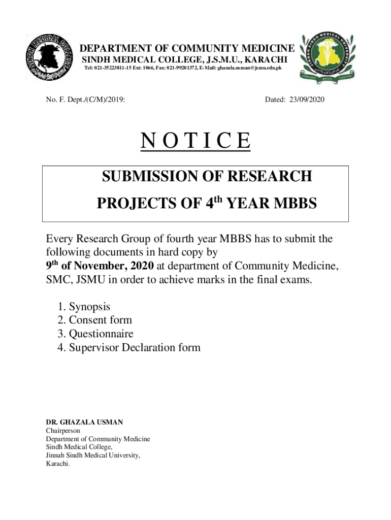 DEPARTMENT OF COMMUNITY MEDICINE SINDH MEDICAL COLLEGE, J.S.M.U., KARACHI Tel: 0213522381115 Ext: 1066, Fax: 02199201372, Email: ghazala.usman@jsmu.edu.pkNo. F. Dept./(C/M)/2019:Dated: 23/09/2020NOTICE