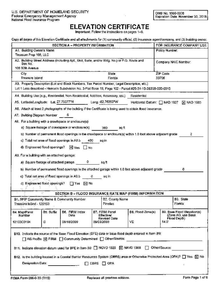 U.S. DEPARTMENT OF HOMELAND SECURITY0MB No. 16600008Federal Emergency Management AgencyExpiration Date: November 30, 2018National Flood insurance ProgramELEVATION CERTIFICATE Important: Follow the