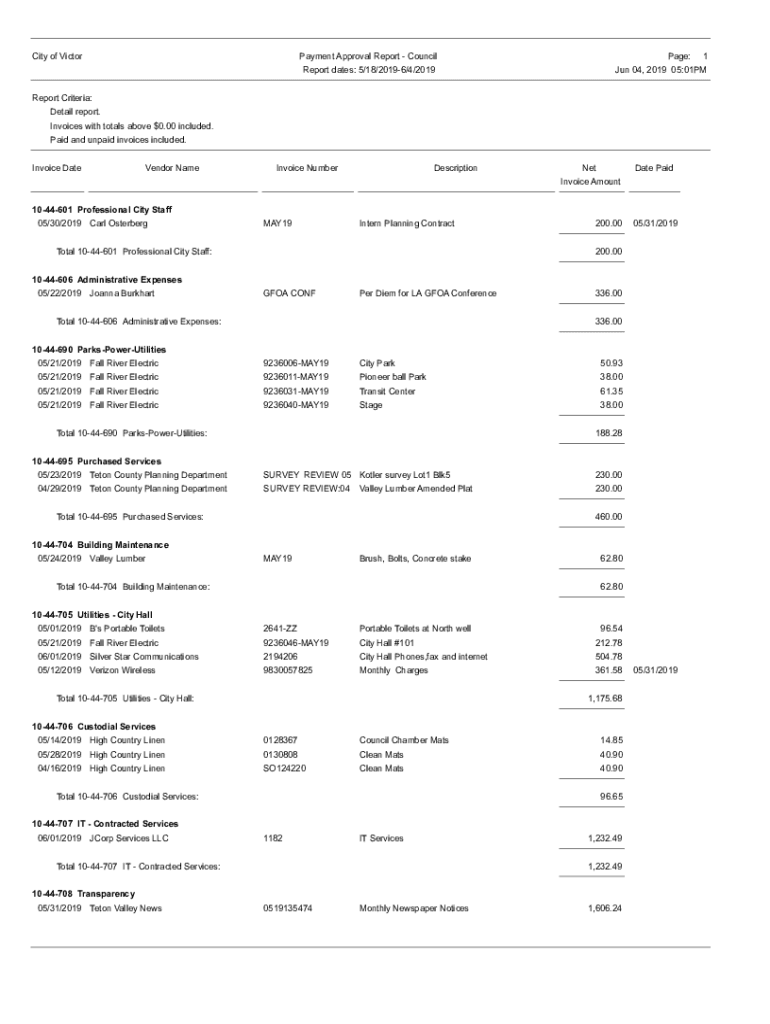 City of VictorPayment Approval Report Council Page:Report dates: 5/18/20196/4/2019 Report Criteria: Detail report. Invoices with totals above $0.00 included. Paid and unpaid invoices included. Invoice