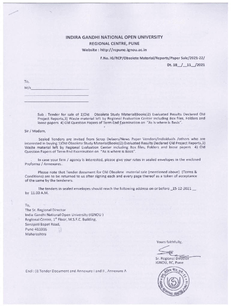 Tender Document for Sale of 1)Old Obsolete Study Material(Books)2) Evaluated Results Declared Old Project Reports,3) Waste material left by Regional Evaluation Center including Box files, Folders