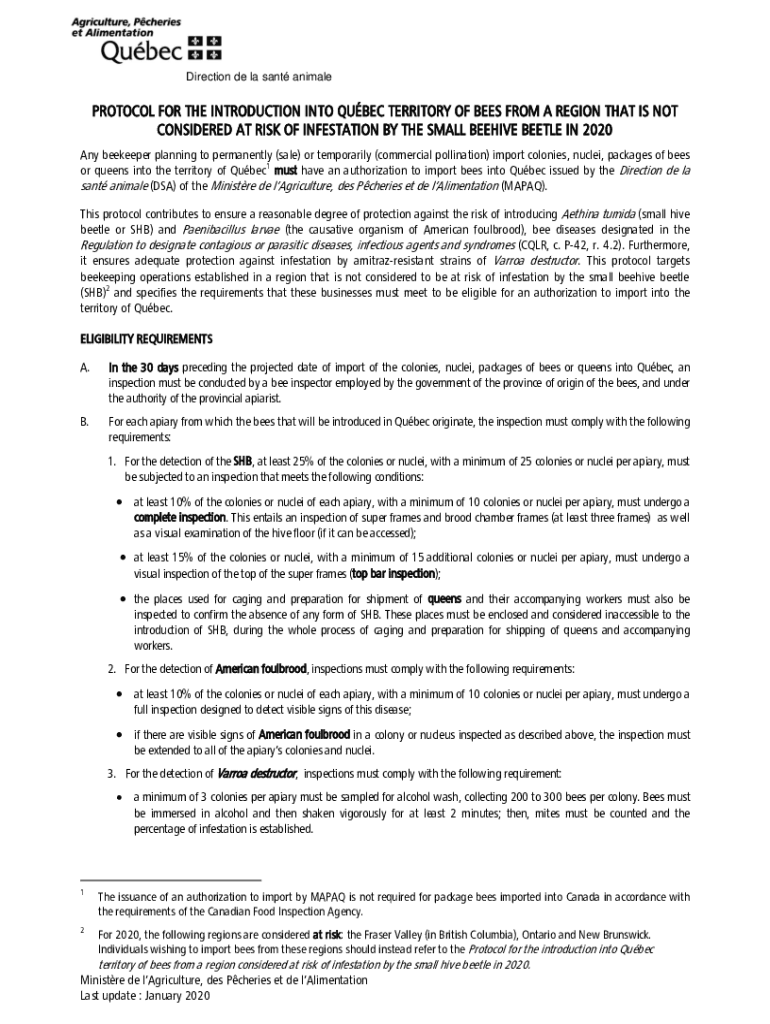 Direction DE la sent animalePROTOCOL FOR THE INTRODUCTION INTO QUEBEC TERRITORY OF BEES FROM A REGION THAT IS NOT CONSIDERED AT RISK OF INFESTATION BY THE SMALL BEEHIVE BEETLE IN 2020 Any beekeeper