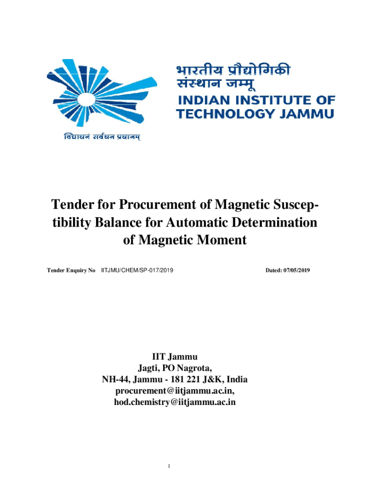 Tender for Procurement of Magnetic Susceptibility Balance for Automatic Determination of Magnetic Moment Tender Inquiry NoIITJMU/CHEM/SP017/2019IIT Jammy Jagti, PO Nag rota, NH44, Jammy 181 221 J&K,