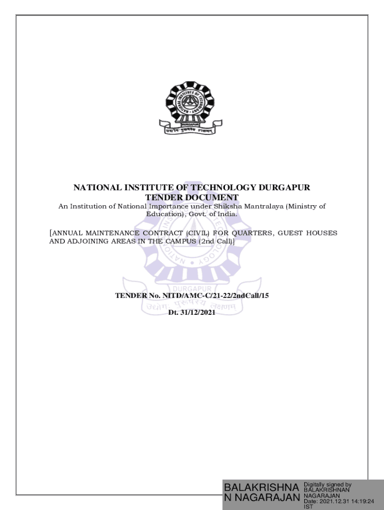 NATIONAL INSTITUTE OF TECHNOLOGY DURGAPUR TENDER DOCUMENT An Institution of National Importance under Shikhar Mandalay (Ministry of Education), Govt. of India.[ANNUALMAINTENANCE CONTRACT (CIVIL) FOR
