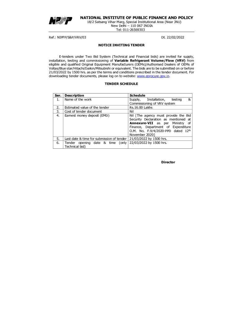 NATIONAL INSTITUTE OF PUBLIC FINANCE AND POLICY 18/2 Sat sang Vicar Mary, Special Institutional Area (Near NU) New Delhi 110 067 INDIA Tel: 01126569303Ref.: NI PFP/S&P/VRV/03Dt. 22/02/2022 NOTICE