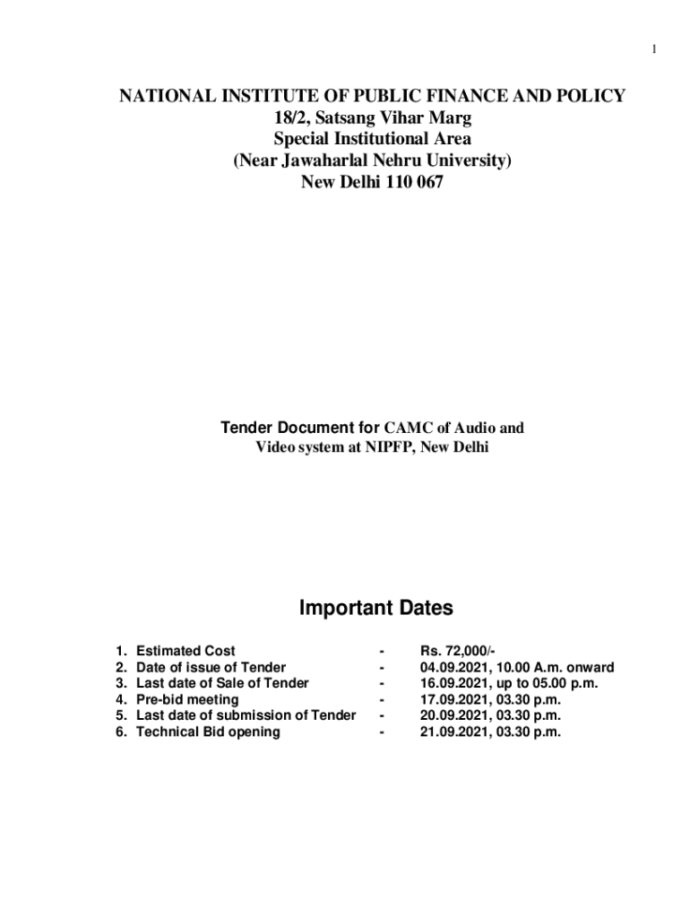 1NATIONAL INSTITUTE OF PUBLIC FINANCE AND POLICY 18/2, Sat sang Vicar Mary Special Institutional Area (Near Jawaharlal Nehru University) New Delhi 110 067Tender Document for CAME of Audio and Video