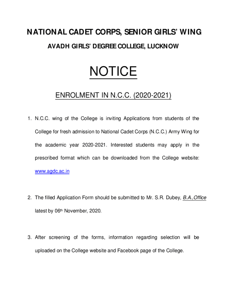 NATIONAL CADET CORPS, SENIOR GIRLS WING AV ADH GIRLS DEGREE COLLEGE, LUCKNOWNOTICE Enrollment IN N.C.C. (20202021) 1. N.C.C. wing of the College is inviting Applications from students of the College
