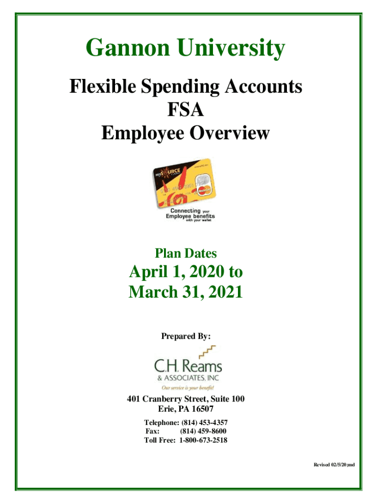 Cannon University Flexible Spending Accounts FSA Employee OverviewPlan Dates April 1, 2020, to March 31, 2021, Prepared By:401 Cranberry Street, Suite 100 Erie, PA 16507 Telephone: (814) 4534357 Fax: