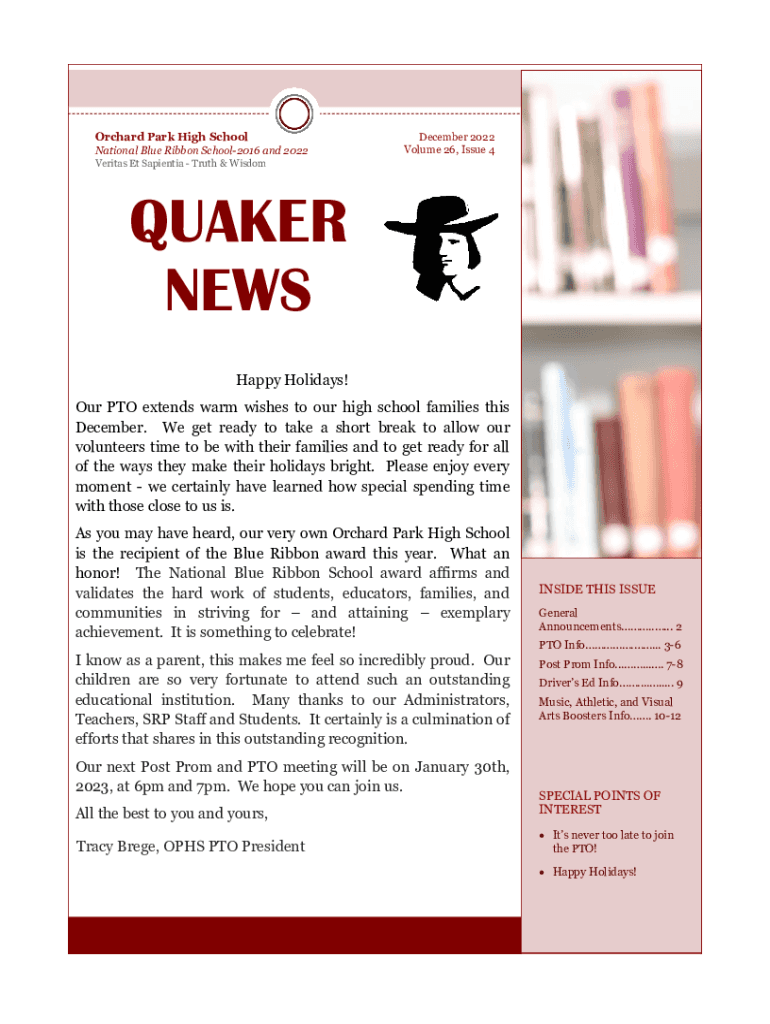 Orchard Park High School National Blue Ribbon School2016 and 2022December 2022 Volume 26, Issue 4Veritas Et Sapient Truth & WisdomQUAKER NEWS Happy Holidays! Our PTO extends warm wishes to our high