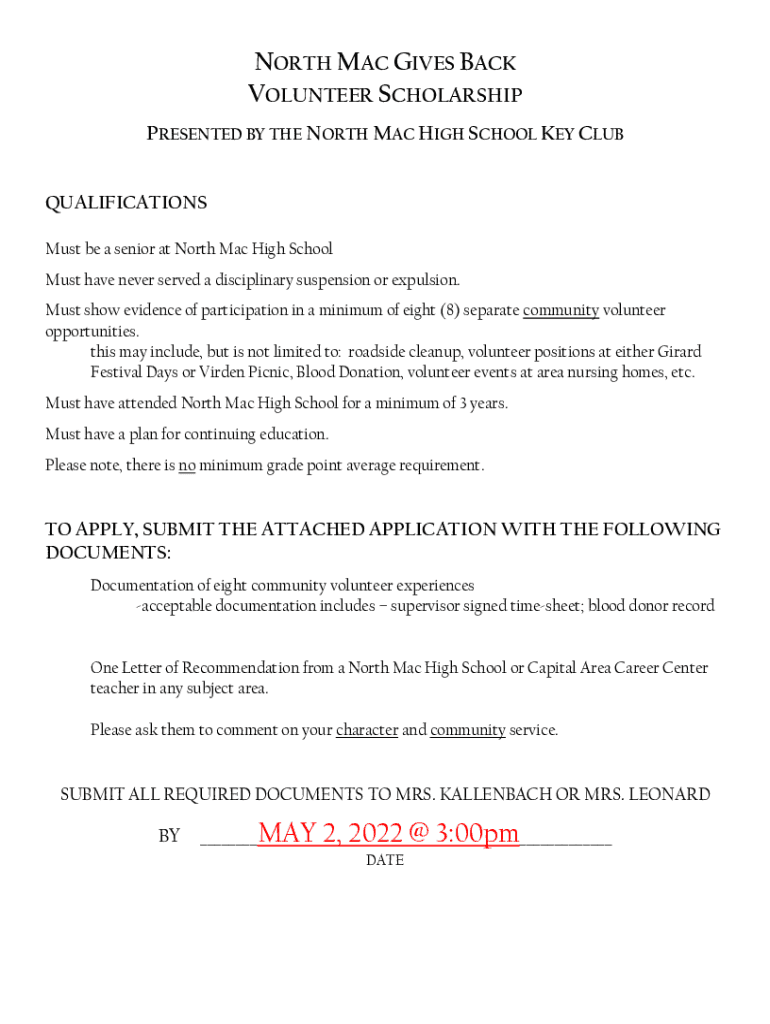 NORTH MAC GIVES BACK VOLUNTEER SCHOLARSHIP PRESENTED BY THE NORTH MAC HIGH SCHOOL KEY CLUB QUALIFICATIONS Must be a senior at North Mac High School Must have never served a disciplinary suspension