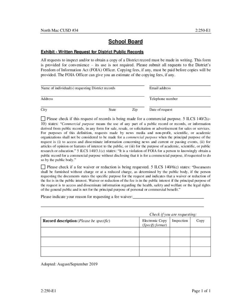 North Mac CUSP #342:250E1School Board Exhibit Written Request for District Public Records All requests to inspect and/or to obtain a copy of a District record must be made in writing. This form is
