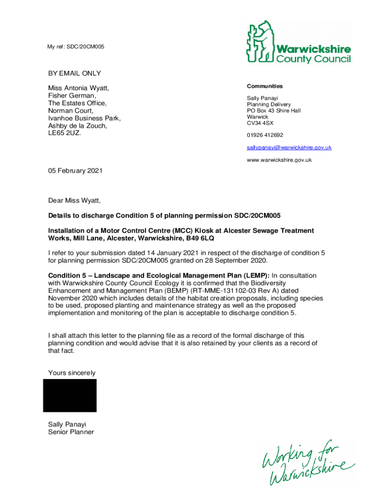 My ref: SDC/20CM005BY EMAIL ONLY Miss Antonia Wyatt, Fisher German, The Estates Office, Norman Court, Ivanhoe Business Park, Ashby de la Touch, LE65 2UZ. Communities Sally Panama Planning Delivery