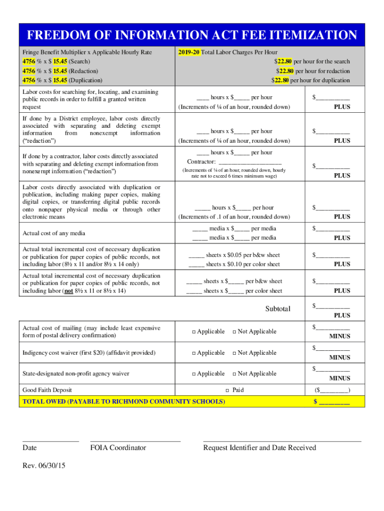 FREEDOM OF INFORMATION ACT FEE ITEMIZATION Fringe Benefit Multiplier x Applicable Hourly Rate 4756 % x $15.45 (Search) 4756 % x $15.45 (Redaction) 4756 % x $15.45 (Duplication)201920 Total Labor Charges