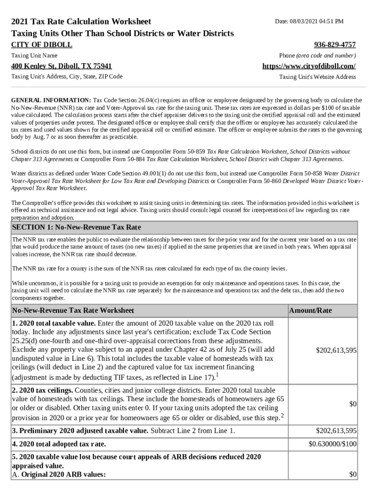 2021 Tax Rate Calculation Worksheet Taxing Units Other Than School Districts or Water DistrictsDate: 08/03/2021 04:51 CITY OF DIBOLL9368294757Taxing Unit Name400 Kenley St, Di boll, TX 75941Phone