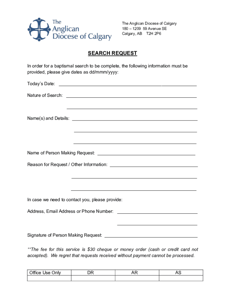The Anglican Diocese of Calgary 180 1209 59 Avenue SE Calgary, AB T2H 2P6SEARCH REQUEST In order for a baptismal search to be complete, the following information must be provided, please give dates
