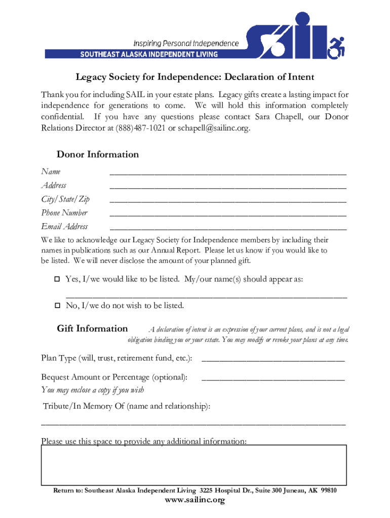 Legacy Society for Independence: Declaration of Intent Thank you for including SAIL in your estate plans. Legacy gifts create a lasting impact for independence for generations to come. We will hold