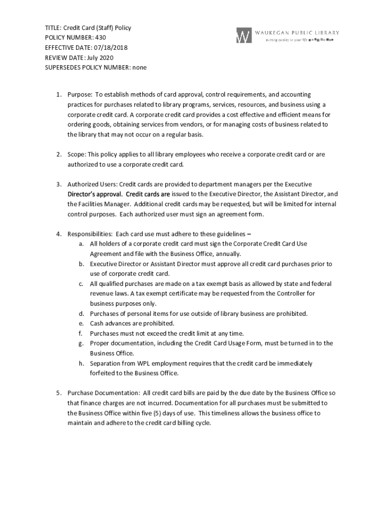TITLE: Credit Card (Staff) Policy NUMBER: 430 EFFECTIVE DATE: 07/18/2018 REVIEW DATE: July 2020 SUPERSEDES POLICY NUMBER: none1. Purpose: To establish methods of card approval, control requirements,