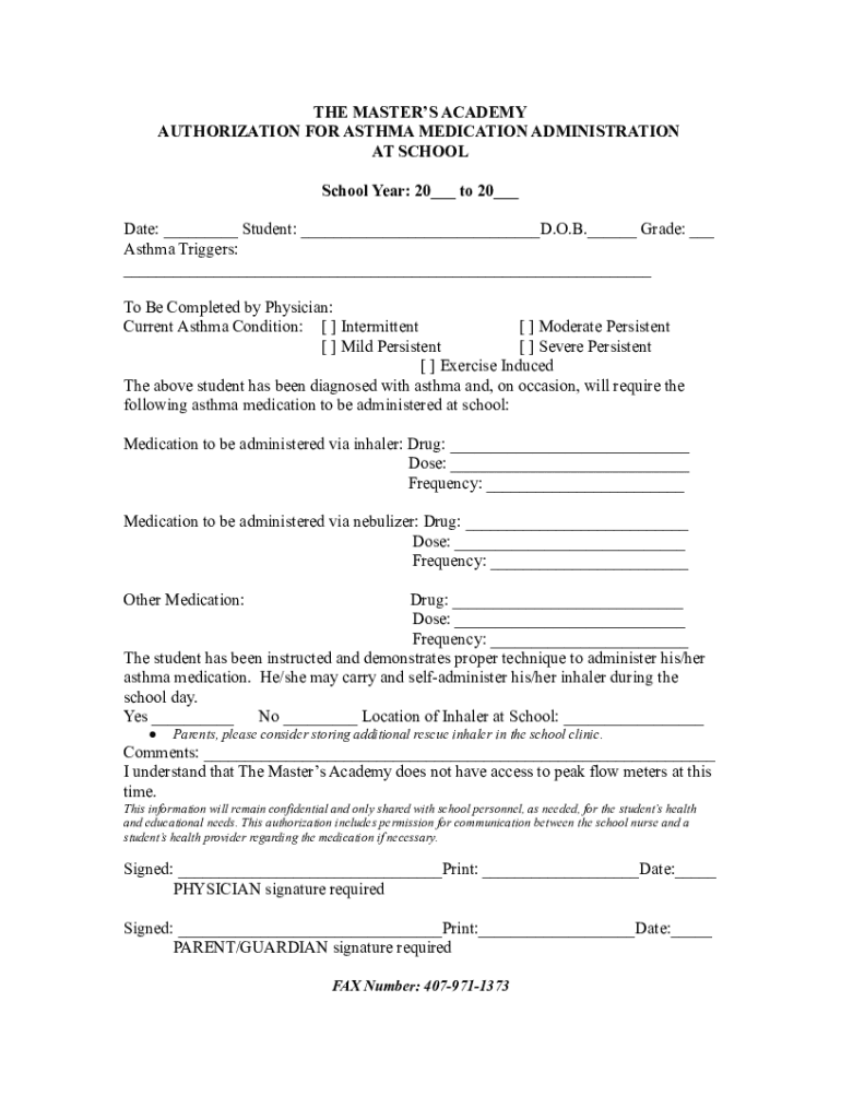 Get the free Asthma Medication Authorization Form - The Master's Academy