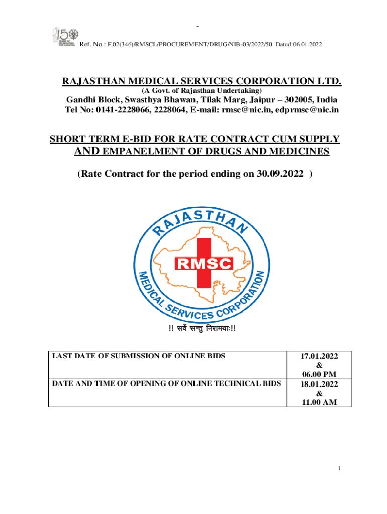 11 Refs. No.: F.02(346)/RM SCL/PROCUREMENT/DRUG/NIB03/2022/50 Dated:06.01.2022RAJASTHAN MEDICAL SERVICES CORPORATION LTD. (A Govt. of Rajasthan Undertaking)Gandhi Block, Swarthy Shawn, Talk Mary,