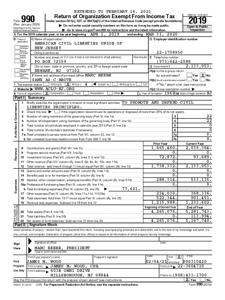EXTENDED TO FEBRUARY 16, 2021990OMB No. 15450047Return of Organization Exempt From Income Reinform (Rev. January 2020)2019Under section 501(c), 527, or 4947(a)(1) of the Internal Revenue Code (except
