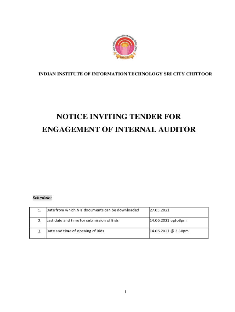 INDIAN INSTITUTE OF INFORMATION TECHNOLOGY SRI CITY CHITTOORNOTICE INVITING TENDER FOR ENGAGEMENT OF INTERNAL AUDITORSchedule: 1. Date from which NIT documents can be downloaded27.05.20212. Last date