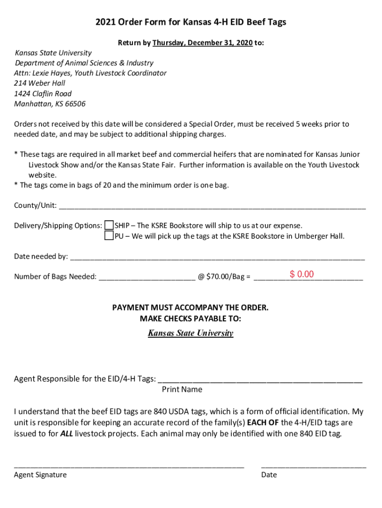 2021 Order Form for Kansas 4H EID Beef Tags Return by Thursday, December 31, 2020, to:Kansas State University Department of Animal Sciences & Industry Attn: Lexis Hayes, Youth Livestock Coordinator