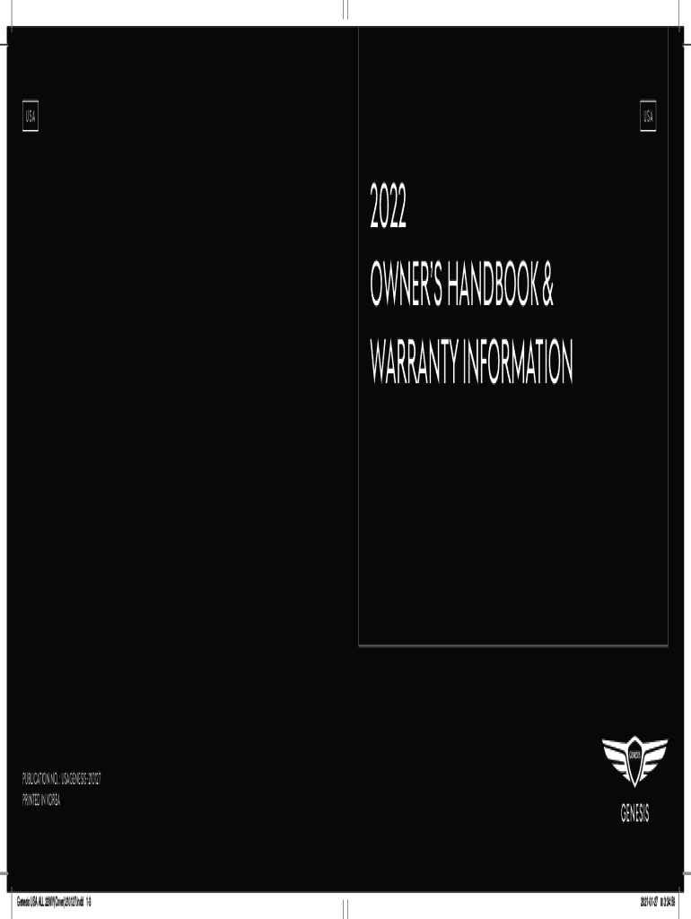 USAUSA2022 Owners Handbook & Warranty InformationPublication No. USAGENESIS210127 Printed in Korea Genesis USA ALL 22MY(Cover)210127. Indy 1320210127 3:34:58IMPORTANT:FOR YOUR CONVENIENCE:Retain this