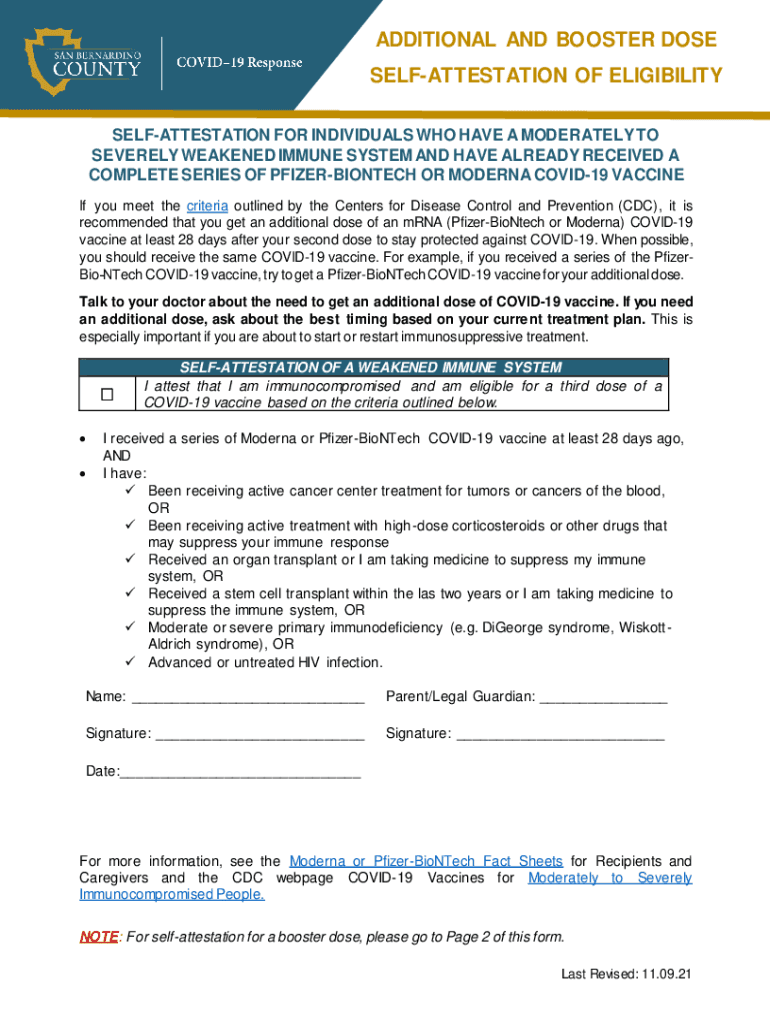 ADDITIONAL AND BOOSTER DOSE SELFATTESTATION OF ELIGIBILITY SELFATTESTATION FOR INDIVIDUALS WHO Has A MODERATELY TO SEVERELY WEAKENED IMMUNE SYSTEM AND HAVE ALREADY RECEIVED A COMPLETE SERIES OF PFIZERBIONTECH
