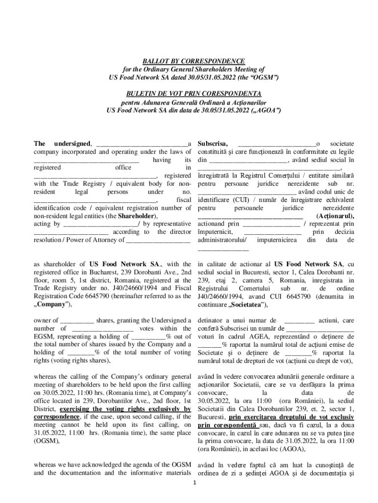 BALLOT BY CORRESPONDENCE for the Ordinary General Shareholders Meeting of US Food Network SA dated 30.05/31.05.2022 (the GSM) BULLETIN DE NOT PRINT CORESPONDENT entry Dunbar General Ordinary an Acionarilor