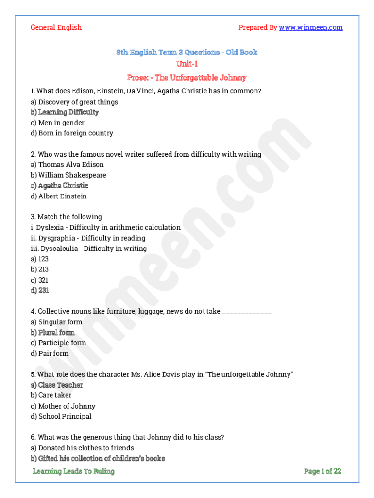 General EnglishPrepared By www.winmeen.com8th English Term 3 Questions Old Book Unit1 Prose: The Unforgettable Johnny 1. What does Edison, Einstein, Da Vinci, Agatha Christie has in common? a) Discovery
