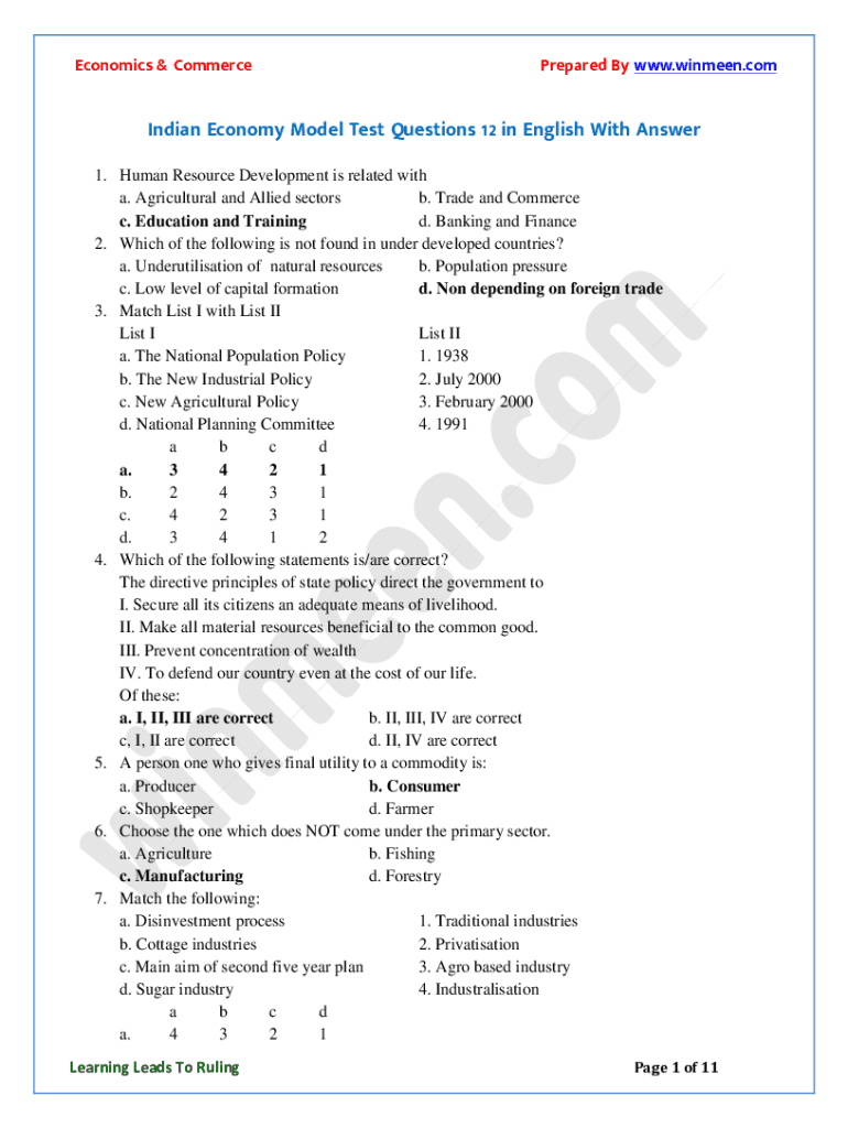 Economics & CommercePrepared By www.winmeen.comIndian Economy Model Test Questions 12 in English With Answer