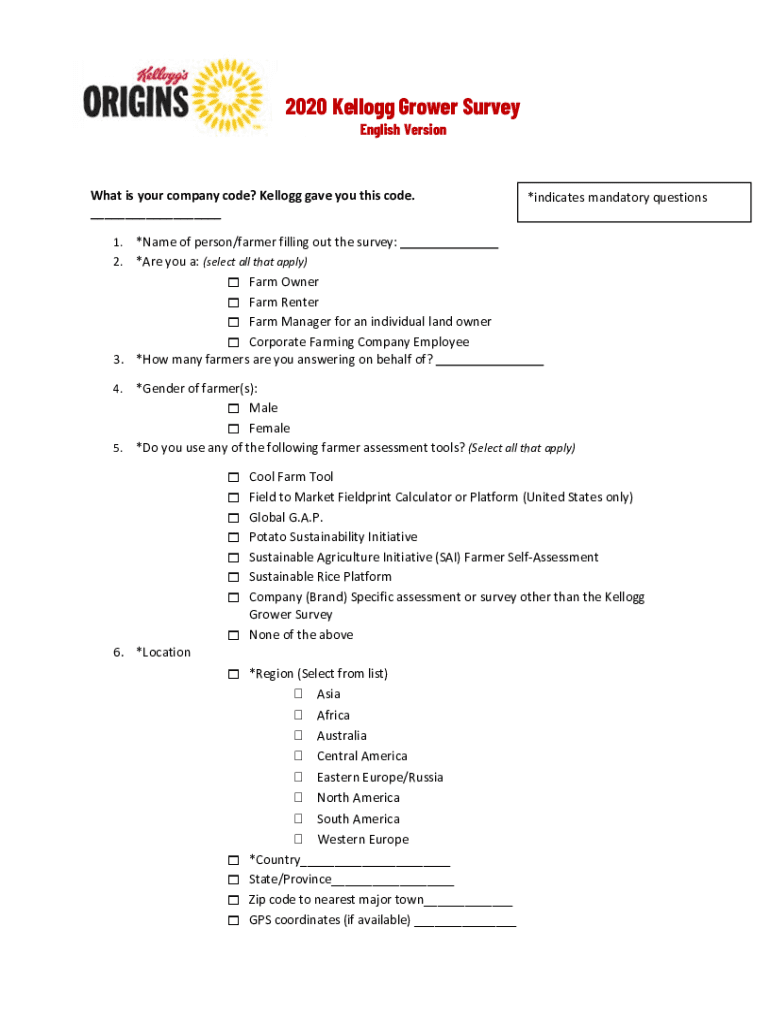 2020 Kellogg Grower Survey English2020 Kellogg Grower Survey English VersionWhat is your company code? Kellogg gave you this code. ___*indicates mandatory questions×Name of person/farmer filling