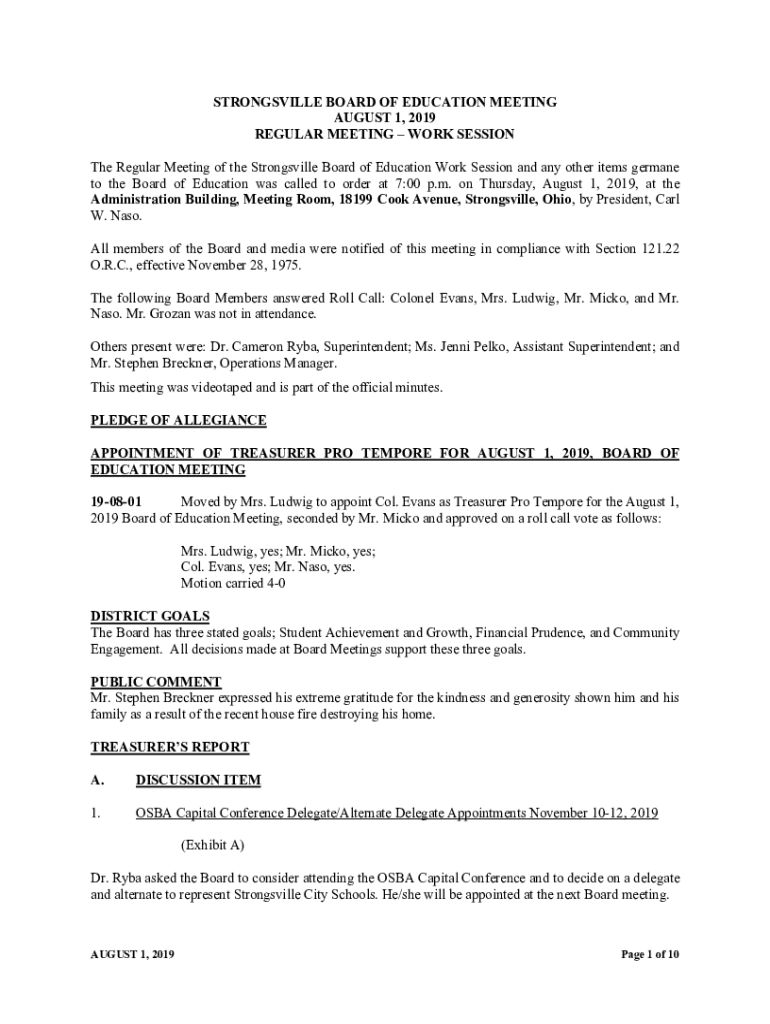 STRONGSVILLE BOARD OF EDUCATION MEETING AUGUST 1, 2019, REGULAR MEETING WORK SESSION The Regular Meeting of the Strongsville Board of Education Work Session and any other items germane to the Board